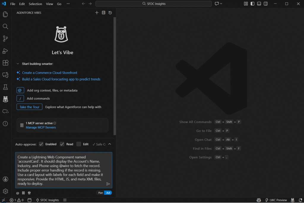 Agentforce Vibes is an AI-powered Salesforce development IDE and VS Code extension that brings intelligence to your coding workflow. It offers smart code suggestions, metadata insights, and automated generation of Apex classes, Lightning Web Components (LWCs), triggers, and more. With the MCP server, Vibes understands your project structure in real time, delivering accurate, context-aware recommendations that help you code faster and with confidence.